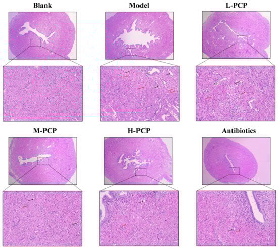 After bacterial infection, the organ index of rats is shown in Table 4. Compared to the blank group, the uterine index in the model group significantly increased (p < 0.05). The uterine index of rats displayed a gradual decrease with escalating doses of PCP, with no significant variance in comparison with the antibiotic-treated group (p > 0.05). In the H-PCP group and antibiotic-treated group, the spleen index exhibited a statistically significant decrease compared to the model group (p < 0.05). Conversely, the results in the L-PCP and M-PCP groups did not demonstrate a significant difference in spleen index compared to the model group (p > 0.05). The liver index did not show any significant differences among all groups (p > 0.05). Notably, an increase in PCP drug concentration correlated with a dose-dependent decline in the liver index.