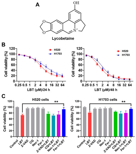 (A) The chemical structure of LBT; (B) the cytotoxicity of LBT toward H520 and H1703 cells, determined by a CCK-8 assay; (C) the cell viability of H520 and H1703 cells treated with LBT (1 µM), Z-VAD (10 µM), CQ (25 µM), Nec-1 (20 µM), and Fer-1 (1 µM), determined by a CCK-8 assay. The results are presented as mean ± SD. ** p < 0.01 versus the control group.