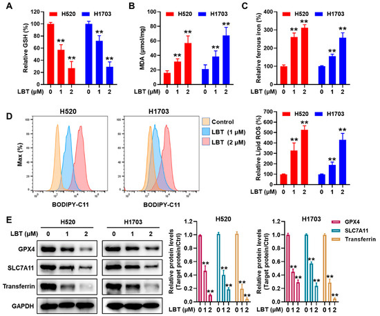 (A) The GSH, (B), MDA, and (C) ferrous iron assays performed after LBT treatment in H520 and H1703 cells; (D) the lipid ROS levels, evaluated using a BODIPY 581/591 C11 probe and flow cytometry; (E) the protein levels of GPX4, SLC7A11, and transferrin in H520 and H1703 cells, examined by Western blot analysis. The results are presented as mean ± SD. ** p < 0.01 versus the control group.