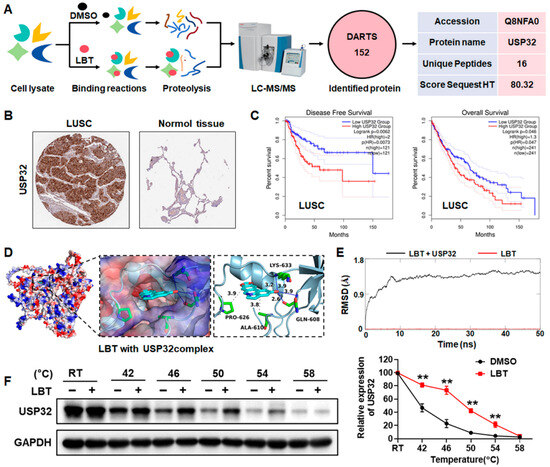 (A) A schematic representation of the procedures used to identify LBT-binding proteins in the DARTS-MS analysis; (B) the expression of USP32 in LUSC and normal human tissues in IHC samples from the HPA database; (C) the correlations between USP32 expression, DFS, and OS in patients with LUSC, analyzed using the GEPIA database; (D) a molecular docking model illustrating the binding of LBT to USP32; (E) the molecular dynamic simulations for LBT–USP32 complexes; (F) the CETSA confirming that LBT targets the USP32 protein. The results are presented as mean ± SD. ** p < 0.01 versus the DMSO group.