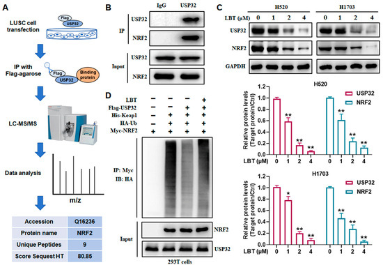 LBT promotes the ubiquitination and degradation of NRF2 through targeting USP32. (A) A workflow to identify USP32–NRF2 interaction using IP-MS analysis; (B) USP32–NRF2 interaction in H520 cells, examined by Co-IP analysis; (C) the protein levels of USP32 and NRF2 in H520 and H1703 cells, examined by Western blot analysis; (D) an in vivo NRF2 ubiquitination assay of 293T cells transfected with Flag-USP32, Keap1, HA-Ub, and MyC-NRF2 upon LBT treatment. The results are presented as mean ± SD. * p < 0.05 and ** p < 0.01 versus the control group.