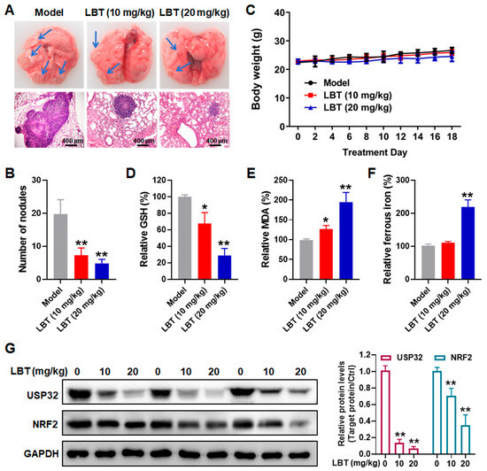 LBT triggers ferroptosis in LUSC orthotopic model. (A) Images of lungs harvested from mice after 18 days of LBT treatment (upper panel), and hematoxylin–eosin (H&E) staining of metastatic nodules in lung tissues (lower panel) (blue arrows indicate tumor tissue areas; scale bar: 400 µm); (B) number of metastasis nodules in the lung tissues; (C) body weight and levels of (D) GSH, (E) MDA, and (F) ferrous iron in each group; (G) protein levels of USP32 and NRF2 in tumors, examined by Western blot analysis. The results are presented as mean ± SD. * p < 0.05 and ** p < 0.01 versus the model group.
