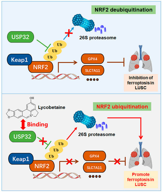 As a pivotal regulatory system for protein homeostasis, DUBs substantially impact ferroptosis by controlling the ubiquitination and stability of ferroptosis-related proteins [17,50]. Studies have shown that the DUB USP11 can bind and promote the deubiquitination modification of NRF2, thereby conferring resistance to ferroptosis in lung cancer cells [51]. In addition, DHPO has been identified as a potent USP7 inhibitor, which has been found to induce ferroptosis in gastric cancer cells by targeting the deubiquitination of Stearoyl-CoA Desaturase mediated by USP7 [52]. Therefore, we tried to demonstrate whether USP32 inhibits the ubiquitination of NRF2 caused by Keap1 and whether LBT enhances the ubiquitination and degradation of NRF2 by targeting USP32 to induce ferroptosis. In our study, we found that USP32 markedly inhibited Keap1-mediated NRF2 ubiquitination and that USP32 overexpression markedly increased NRF2 protein levels, which demonstrated that USP32 is a DUB of NRF2. Meanwhile, LBT effectively inhibited USP32-mediated NRF2 deubiquitination and the protein levels of USP32 and NRF2, whereas USP32 overexpression markedly reversed the inhibitory effects on LUSC cell proliferation and the occurrence of ferroptosis induced by LBT. These results indicated that LBT is a promising USP32 inhibitor and may have favorable pharmacokinetic profiles (Figure 7). While our study identified USP32 as a critical target of LBT-induced ferroptosis via its regulation of NRF2 deubiquitination, the complexity of ferroptosis signaling suggests the existence of additional targets and pathways that may contribute to the therapeutic effects of LBT. To address this, future investigations should leverage emerging target-discovery technologies, such as PROTAC (proteolysis-targeting chimera) probe technology, which enables the selective degradation of target proteins and facilitates mechanistic exploration in dynamic cellular contexts [53]. Complementary proteomic approaches, including interactome profiling and post-translational modification analyses, could further unravel global protein networks and signaling cascades modulated by natural products [54,55]. Integrating these advanced methodologies could not only refine our understanding of natural product-driven ferroptosis but also uncover novel therapeutic vulnerabilities for ferroptosis-driven malignancies, ultimately enhancing the translational potential of natural products.