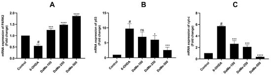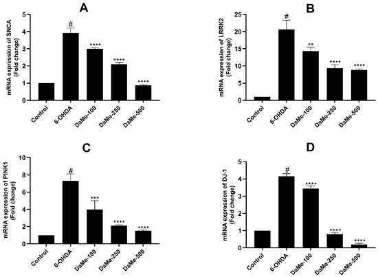 3.7. Effect of the DaMe on Expressions of Parkinson’s Disease and Apoptosis-Related Genes in 6-OHDA-Induced SH-SY5Y Cells