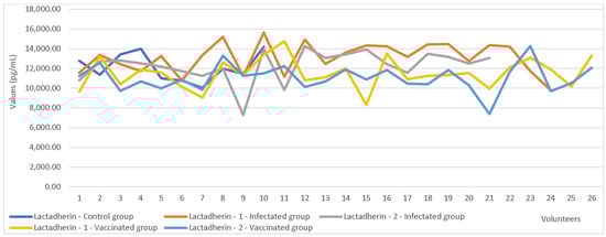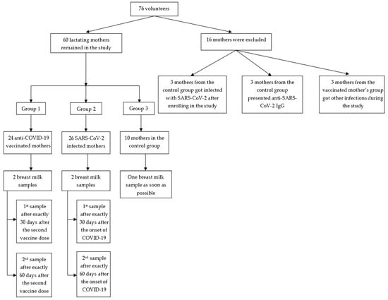 The volunteers were closely monitored for 70 days, beginning from the onset of symptoms or the date of vaccination, up to 10 days following the second breast milk sample collection. This monitoring period aimed to observe whether the second sample coincided with the onset of any additional infections or inflammation that could influence the results. Similarly, the control group mothers were followed for 10 days after providing their samples to detect any infections or inflammations that could potentially affect the concentrations of the tested parameters.