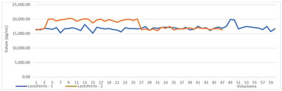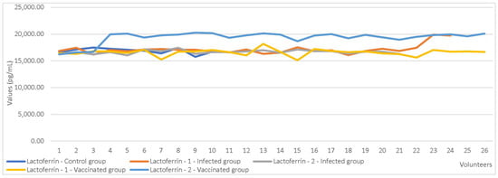 In our study, higher levels of LF were also associated with the presence of IgG antibodies against SARS-CoV-2 in the serum of participants. The increased LF levels in immunized mothers reflect heightened immune activation, antimicrobial defense mechanisms, and an adaptive response aimed at enhancing protection for both the mother and the nursing infant through breast milk. This rise in LF levels observed by us can be attributed to various immunological and physiological factors. Following vaccination, especially against viral pathogens like SARS-CoV-2, there is an elevated production of immune components, including LF. As an acute-phase protein with antimicrobial properties, LF levels surge in response to immune activation, providing enhanced protection to both the mother and the breastfeeding infant. Vaccination has been shown to modify the composition of breast milk by increasing immune factors that support the infant’s immunity [53]. Additionally, LF plays a crucial role in anti-inflammatory and immunomodulatory activities, contributing to immune regulation and maintaining homeostasis [16]. This increase in LF provides passive immunity to the infant, offering an additional layer of protection. Elevated LF levels likely reflect the maternal immune response aimed at transferring enhanced protection to the infant, especially against viral infections such as COVID-19 [54,55].