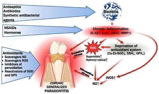 The main molecular and biochemical links in the pathogenesis of chronic periodontitis and the primary methods of pharmacocorrection. Periodontal disease is characterized by a chronic bacterial infection of the oral cavity (Porphyromonas gingivalis, Actinobacillus actinomycetemcomitans, Tannerella forsythensis, and Treponema denticola), which leads to inflammation of the gums (increased IL-1β, IL-6, TNF-α, and matrix metalloproteinases), activation of reactive oxygen species (ROS), and deprivation of antioxidant systems, resulting in the gradual destruction of periodontal tissues and alveolar bone supporting the teeth. Treatment for periodontitis includes antiseptics, antibiotics, astringents, anti-inflammatory drugs and considering the role of oxidative stress and antioxidants. ↑ means increase, ↓ means decrease.