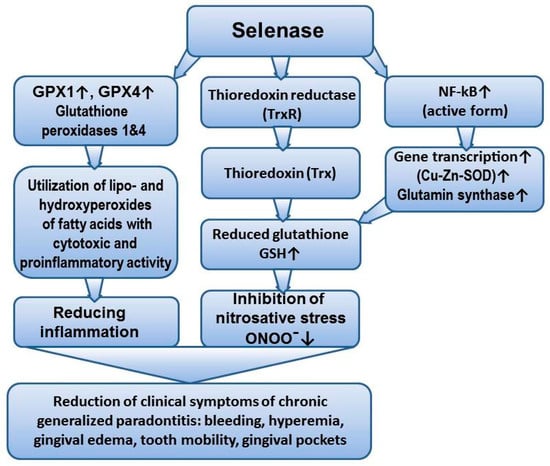 Suppression of Zn/Cu SOD expression in inflammatory periodontal diseases increases the production of inflammasome components of the NOD-like receptor protein 3 (NLRP3) inflammasome. Given that Zn/Cu SOD exerts a protective effect by inhibiting the NLRP–caspase-1–IL-1β inflammasome axis during inflammation, the reduction in expression and activity of this enzyme not only intensifies inflammation but also leads to a recurrent surge in ROS production during the course of inflammatory reactions in the periodontium [37]. The observed decrease in plasma levels of CGP, GPX-4 expression, and the increase in GSSG in rats have been confirmed by other studies and may be associated with both the activation of free radical reactions and the deprivation of specific components of the glutathione system. In patients with periodontitis, there is a reduction in the overall antioxidant capacity in saliva, as well as lower concentrations of reduced glutathione (GSH) in serum and gingival fluid. Periodontal therapy restores the redox balance. Therapeutic considerations regarding the supplementary use of glutathione or pharmacological agents that modulate its cellular levels in the treatment of periodontitis, to limit tissue damage related to oxidative stress and improve wound healing, should not be underestimated [38]. It has been shown that pharmacological elevation of GSH levels in monocytes and macrophages blocks H2O2-dependent activation of NF-κB and, indirectly, the proinflammatory cytokines TNF-α and IL-1β. An excess of cytotoxic forms of NO leads to the nitration of proteins involved in GSH synthesis, resulting in a decrease in its concentration [9,39]. GPX-4 is the main regulator of ferroptosis, interrupting lipid peroxidation by converting lipid hydroperoxides into non-toxic lipid alcohols. Therefore, the reduction in its expression in the plasma of rats with CGP is interpreted as an enhancement of lipid peroxidation processes, particularly of arachidonic acid, leading to a surge in inflammation through the increased production of proinflammatory prostaglandins and stable carbonylated products (ketones, aldehydes, trans-2-nonenal). Additionally, the inhibition of GPX-4 triggers ferroptosis and the death of osteocytic cells [40]. It is known that increased production of TNF-α, IL-1β, IL-6, and IL-8 occurs in connection with GSH deficiency, and its modulation not only reduces oxidative stress activity but also inflammation in the periodontium [41,42]. There is an opinion that the glutathione component of the thiol-disulfide system is stimulated by selenium derivatives. The protective action of selenium in mammalian cells is mediated by seleno-amino acids, either selenocysteine or selenomethionine. The active site of powerful glutathione peroxidases (GPXs) contains selenocysteine residues. Additionally, it has been shown that other selenoproteins (such as selenoprotein P and thioredoxin reductase) also possess antioxidant properties [43,44]. Selenium may play a role in the regulation of redox states of proteins, such as NF-κB transcription factors, by regulating the synthesis of enzymes (antioxidants, those involved in energy metabolism, and glutathione synthesis) (Figure 3).