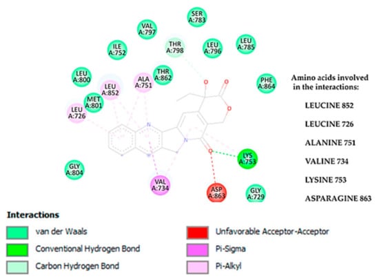 Two-dimensional interaction diagram between camptothecin and the EGFR. Hydrogen bond, van der Waals, pi-alkyl, and pi–sigma are the interactions obtained between camptothecin and the EGFR.