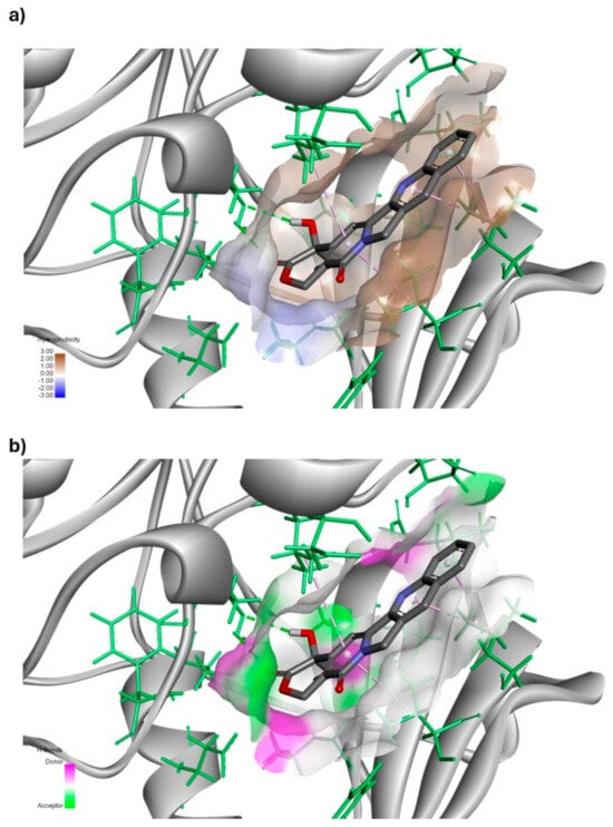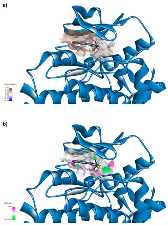 In contrast, diagram (b) highlights the areas of the protein surface capable of forming hydrogen bonds. These regions are divided based on their ability to act as hydrogen bond donors or acceptors, providing a detailed view of potential polar interactions. By comparing both diagrams, it is evident that while some hydrogen bonding is possible, hydrophobic interactions dominate the binding interface between the ligand and receptor. The overlap of these diagrams confirms that the ligand engages primarily in non-polar, hydrophobic interactions, rather than polar or hydrogen-bonding ones, due to the chemical composition of the receptor surface. This visualization reinforces the conclusion that hydrophobic forces are the main driving force stabilizing the ligand–receptor complex, which is crucial for understanding the binding behavior and potential selectivity of the ligand.