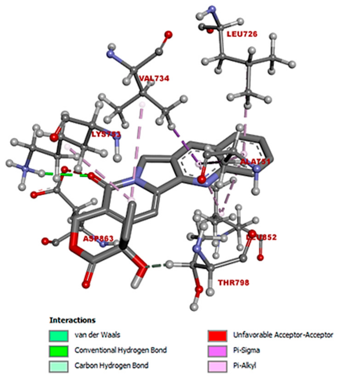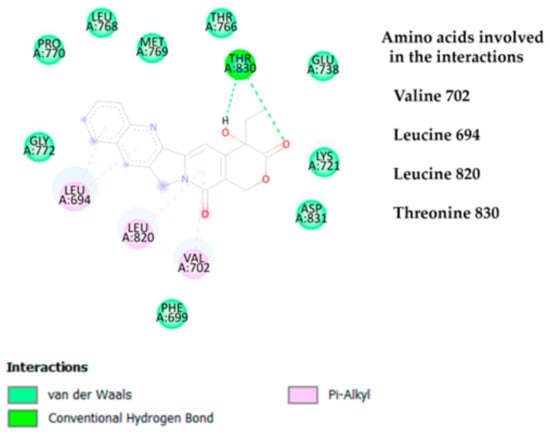 In addition to hydrogen bonding, hydrophobic interactions predominated in the interaction profile of camptothecin with the EGFR. Amino acid residues such as Leucine 694, Leucine 820, and Valine 702 primarily engage in pi–alkyl interactions with camptothecin. These pi–alkyl interactions may be due to the structural nature of camptothecin, which consists predominantly of aromatic rings. Aromatic rings typically promote hydrophobic interactions with the side chains of these amino acids, particularly in environments where pi–alkyl stacking is common. As a result, camptothecin establishes a network of primarily hydrophobic interactions with the receptor.