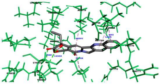 The results of camptothecin binding with the EGFR yielded less favorable binding energies in comparison to the interactions observed with the HER-2 receptor. As illustrated in Figure 4, camptothecin’s binding mode with the EGFR involves various interactions with key amino acid residues. Specifically, the residue Tyrosine 830 plays a critical role by forming hydrogen bond interactions with camptothecin, which likely contributes to the overall stabilization of the ligand–receptor complex, despite the relatively weaker binding affinity.