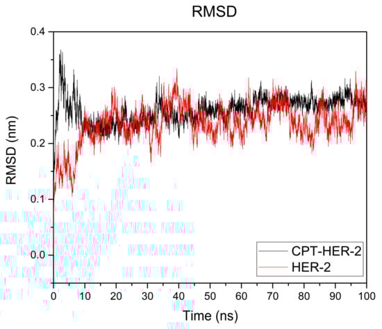 RMSD (root mean square deviation) graph at 100 nanoseconds between camptothecin and the HER2 receptor. The graph shows the stability of the protein–ligand complex (black line) and stability of HER-2 alone (red line).