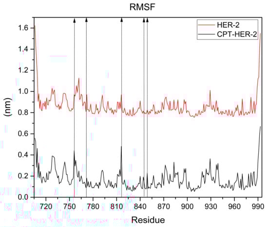 Notably, throughout the 100 nanoseconds of the simulation, there were no significant fluctuations in the RMSD, which further supports the hypothesis that the binding interaction between camptothecin and the HER2 receptor remains stable over time. This consistency implies that the ligand is well fitted within the binding pocket of the HER2 protein and that the interactions formed are robust enough to maintain the structural integrity of the complex. Additionally, the simulation does not indicate any significant conformational changes in the HER2 protein during the evaluated period, suggesting that the binding of camptothecin does not induce major alterations in the protein’s structure. This is supported by Figure 8, which displays the RMSF graph for the HER2–camptothecin complex (black line) and HER2 alone (red line). The graph illustrates the fluctuations of each amino acid residue in the HER2 protein. Notably, only the amino acid residues bonded to camptothecin show negligible fluctuations, measuring less than 0.5 nm, indicating that the protein maintains structural stability. These findings reinforce the potential of camptothecin as a stable ligand for HER2 targeting in breast cancer therapy.