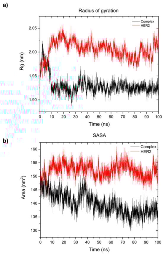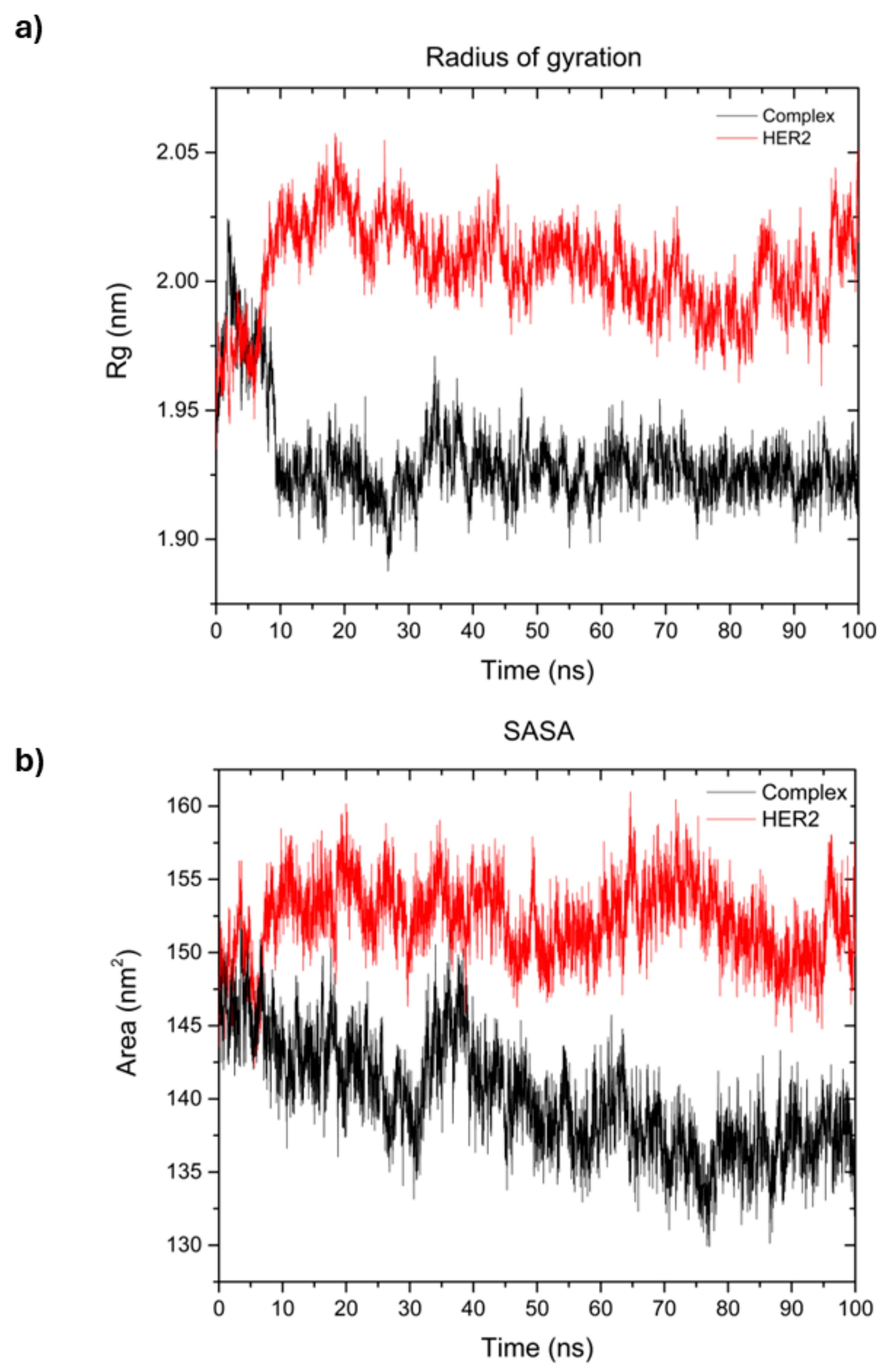 To determine if the binding of camptothecin affected the protein’s folding, we plotted the radius of gyration (Rg). This is illustrated in Figure 9, (a) where the red line represents HER2, and the black curve depicts the protein–ligand complex. The red curve representing HER2 alone shows that after the initial 10 nanoseconds, the protein’s compactness remains relatively stable, averaging a Rg of 2 nm. In contrast, the curve for the complex reveals that, similar to the HER2 receptor, the protein’s compactness remains consistent after the first 10 nanoseconds, averaging a Rg of 1.9 nm throughout the 100 ns simulation. This indicates that the protein remains more stable and folded, showing less variability than the HER2 protein alone. The lower average value of the complex, in comparison to the protein alone, suggests that there are no structural or folding changes occurring in the protein. This indicates that the complex remains stable throughout the duration of the simulation. Panel (b) displays the analysis of the solvent accessible surface area (SASA) to assess the protein’s stability. Higher values in nm2 suggest a loss of structural relaxation, indicating reduced stability in the protein. The red curve for the HER2 protein alone shows an average value of 155 nm2. The black curve represents the camptothecin–HER2 complex, which recorded an average value of 142 nm2. This indicates that the protein exhibits better stability when the complex is formed compared to the protein alone, even though the values of both the protein and the complex are relatively similar for both the Rg and SASA results. Molecular dynamics simulations demonstrated the stability of the camptothecin–HER2 complex, further supporting its potential as a therapeutic agent.