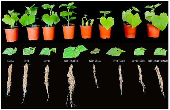 Effects of PGPR (S. fonticola (S1T1) and P. koreensis (S4T10)) inoculation on cucumber plants under NaCl stress. The figure presents the phenotypic response of cucumber plants subjected to different treatments, including control (untreated), inoculation with S. fonticola (S1T1), P. koreensis (S4T10), and their combined application (S1T1+S4T10), both in the absence and presence of NaCl-induced salinity stress.