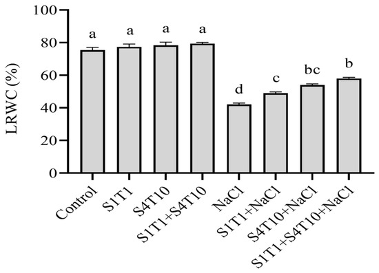 Influence of the PGPRs on the LRWC of cucumber plants under both normal and salt stress conditions. The data are presented as the mean values and standard error bars from three replicates. Different letters on the mean bars indicate significant differences according to DMRT analysis.