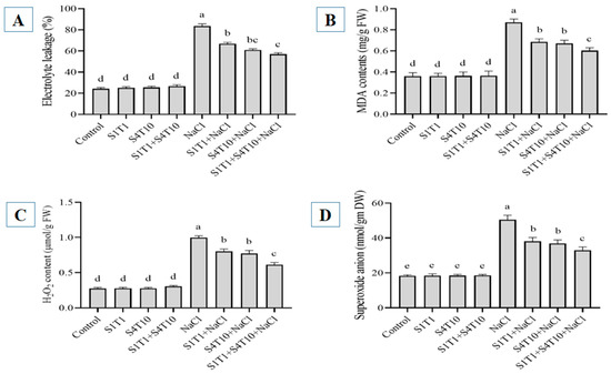 The EL, MDA, H2O2, and superoxide anion contents were assessed to determine the impact of the PGPRs and NaCl stress on the membrane integrity of the plant. The findings indicated a notable increase in electrolyte leakage, MDA, H2O2, and superoxide anion levels under NaCl-induced stress (Figure 3). The plants under salt stress revealed more electrolyte leakage from the leaf tissues than the control (treated only with water) plants. Comparatively, applying S1T1 and S4T10 individually and their combined application under NaCl stress reduced electrolyte leakage up to 19, 27, and 31%, respectively (Figure 3A). Salt stress adversely affected the membranes of these plants compared to the plants treated with PGPRs. The analysis of the MDA contents revealed the extent of lipid peroxidation (LPO); higher MDA levels were observed in the cucumber plants treated with NaCl compared to those in the normal control plants. In contrast, the individual and synergistic inoculation of the PGPRs decreased the MDA levels of the cucumber plants by 21, 23, and 30%, respectively, under salinity conditions (Figure 3B).