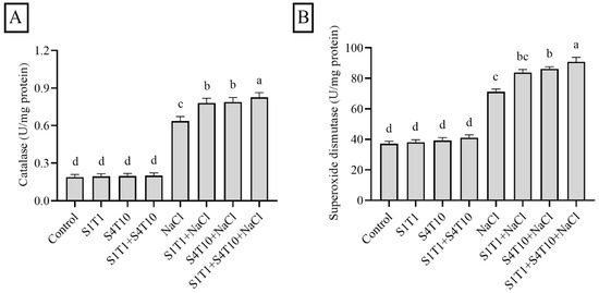 Plants activate antioxidants to regulate ROS generation and mitigate the detrimental effects of external stressors, including NaCl stress. Higher salt concentrations affect both soil properties and microbial processes, including respiration and enzyme activity. The enzymatic activity of SOD and CAT in the cucumber plants under normal and NaCl stress conditions, with and without PGPRs, was assessed (Figure 4). PGPR application under NaCl stress enhanced the SOD and CAT activity compared to that in the plants subjected to NaCl stress alone. The inoculation of S. fonticola (S1T1) and P. koreensis (S4T10) increased CAT biosynthesis by 22% and 23%, respectively. Furthermore, the combined application of the PGPRs further enhanced CAT production to 29% under salt stress conditions (Figure 4A). Likewise, the cucumber plants showed a similar pattern for SOD under NaCl stress conditions. Under salt stress conditions, the PGPRs enhanced SOD biosynthesis, whereby S1T1 produced a 17% increase and S4T10 produced an approximately 21% increase in the biosynthesis of SOD. On the other hand, the synergistic application of the PGPRs revealed a 27% increase in the activity of SOD (Figure 4B). Therefore, the levels of the analyzed antioxidant enzymes increased in the cucumber plants upon the inoculation with the multi-trait PGPRs.