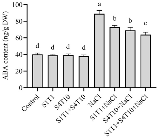 ABA is essential in modulating plant growth and performance, particularly in response to abiotic stressors, such as NaCl stress. Furthermore, PGPRs have been reported to promote prominent effects on regulating ABA in plants under stressful conditions. Therefore, the impact of PGPRs on the ABA content in the cucumber plants was assessed under NaCl stress conditions. Based on the research results, the plants under stress had significantly higher ABA concentrations than those in the control plants. Conversely, the plants treated with PGPRs under NaCl stress exhibited a modulated ABA content. As a result, under NaCl stress settings, the levels of ABA produced increased exponentially, in contrast to the plants treated with S. fonticola (S1T1) and P. koreensis (S4T10), which showed decreases of 18% and 22%, respectively. By contrast, the combined application of these PGPRs demonstrated a 28% decrease in the ABA content under salt stress conditions (Figure 5).