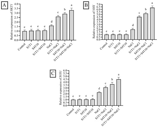 HKT1, NHX, and SOS1 were upregulated in the cucumber plants under NaCl stress. On the other hand, transcript accumulation of the HKT1, NHX, and SOS1 genes was augmented in the cucumber plants inoculated with PGPRs. The expression of HKT1 was enhanced by 1-fold under S. fonticola (S1T1) and 1.3-fold under P. koreensis (S4T10) compared to that in the NaCl-stressed control plants. Meanwhile, the combined application of S1T1 and S4T10 promoted a 1.7-fold increase in the expression of HKT1 (Figure 6A). Thus, applying S. fonticola (S1T1) and P. koreensis (S4T10) to cucumber plants under NaCl stress can induce adaptability, which results in a significant increase in HKT1.