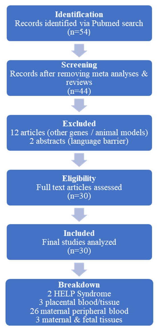 Furthermore, two studies were disqualified because of language obstacles; their English abstracts were insufficient for a thorough analysis, and their complete texts were only available in Chinese and Portuguese. Of the included studies, 26 examined VEGF polymorphisms in maternal peripheral blood, 7 used placental blood or tissue, and 2 examined HELLP syndrome. Figure 1 illustrates the study selection process.