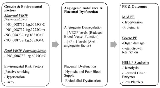 When paired with other risk variables, including maternal age, parity, and environmental exposures, VEGF polymorphisms may be useful biomarkers for identifying women who are at high risk for PE, according to the mounting body of research. Identifying particular VEGF genotypes associated with protective benefits (e.g., NG_008732.1:g.6075G and NG_008732.1:g.3222A) or increased risk (e.g., NG_008732.1:g.5383C/C and NG_008732.1:g.2549_2550del/del) may aid doctors in better managing and predicting PE. Additionally, by comprehending the function of VEGF polymorphisms, tailored treatment plans that reduce the risk of PE and enhance the health of both the mother and the fetus may be developed. To rebalance pro- and anti-angiogenic factors in preeclamptic pregnancies, this may entail angiogenesis pathway-targeting therapies. Figure 2 outlines the interplay between the genetic and environmental factors influencing angiogenesis, leading to placental dysfunction and various clinical outcomes of PE.
