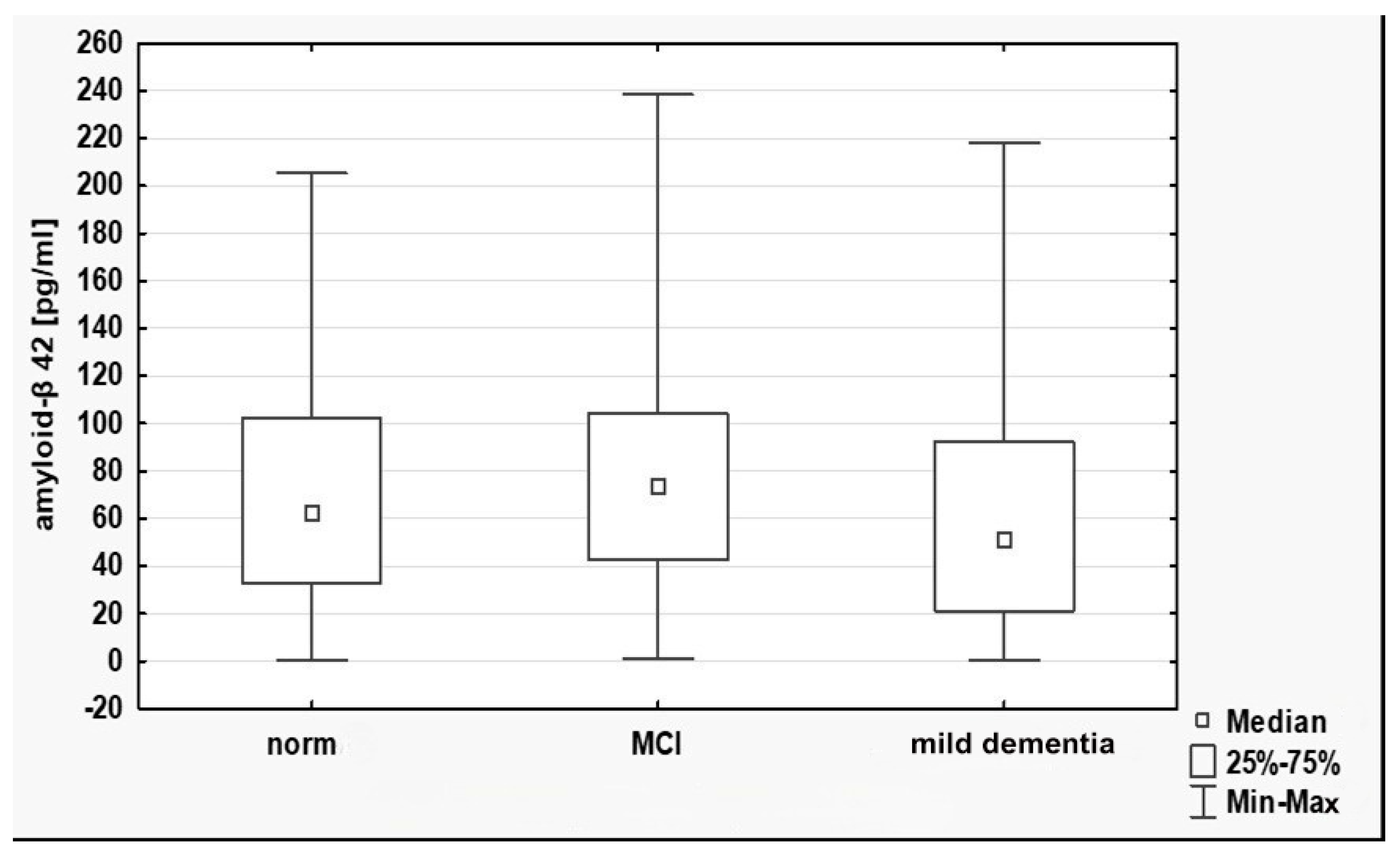 | Amyloid-β 42 | 62.8 [32.8–102.4] | 73.5 [42.4–104.5] | 51.6 [21.2–92.6] | 0.198 |