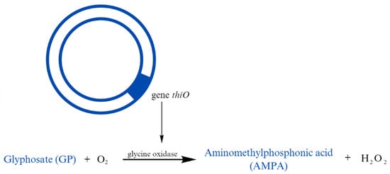 One of the commonly used herbicides is glyphosate (GP), which has a broad spectrum of activity against both perennial and annual weeds [105]. Its negative impact on the soil microbiome involves inhibiting the shikimate pathway, which reduces the availability of important nutrients [106]. The most effective way to defend against the harmful effects of glyphosate is its degradation to aminomethylphosphonic acid (AMPA), which is also toxic, but to a lesser extent [107,108]. Some Bradyrhizobium species possess the glycine oxidase gene (thiO), which participates in the oxidation of GP to AMPA, thereby influencing the concentration of the herbicide in the soil (Figure 1) [109]. These studies suggest that these strains have a greater ability to survive in environments contaminated with these harmful chemicals, which helps maintain agricultural productivity.