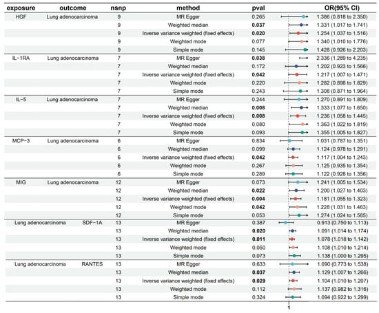 During the selection of IVs, forward MR analysis identified a causal relationship between LUAD and SNPs associated with hepatocyte growth factor (HGF), interleukin-1 receptor antagonist (IL-1RA), IL-5, monocyte chemoattractant protein-3 (MCP-3), and monokine induced by interferon-γ (MIG). The number of corresponding SNPs for each cytokine was 9, 7, 7, 6, and 12, respectively. In reverse MR Analysis, 13 SNPS in normal T cell expressed and secreted factor (RANTES) and stromal cell-derived factor-1α (SDF-1A) were each found to be causally associated with LUAD (Supplementary Table S2). Inverse variance-weighted (IVW) analysis demonstrated significant positive causal associations between LUAD and the inflammatory cytokines HGF (IVW-OR: 1.254, p = 0.020), IL-1RA (IVW-OR: 1.217, p = 0.042), IL-5 (IVW-OR: 1.236, p = 0.008), MCP-3 (IVW-OR: 1.117, p = 0.042), and MIG (IVW-OR: 1.181, p = 0.004). Meanwhile, in the reverse MR analysis, LUAD was found to have a causal relationship with elevated levels of RANTES and SDF-1A, with IVW results showing an odds ratio of 1.104 (p = 0.029) for RANTES and 1.078 (p = 0.011) for SDF-1A (Figure 1).