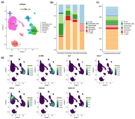 The scRNA-seq dataset GSE223923 was retrieved from the Gene Expression Omnibus (GEO, https://www.ncbi.nlm.nih.gov/geo/, accessed on 29 June 2024) [14], which includes four LUAD samples. Data preprocessing was conducted using the “Seurat” package (version 5.1.0), with stringent quality control applied to filter out low-quality cells. A doublet detection procedure was implemented, followed by standardization, feature selection, and normalization of the data. Principal component analysis was performed to identify key sources of variation. The harmony algorithm was employed to integrate data and eliminate batch effects. Dimensionality reduction and clustering were conducted using the uniform manifold approximation and projection (umap) algorithm to define cell subpopulations. Cell type annotation was performed using the “SingleR” tool (version 2.4.1) based on cell type-specific gene sets [15]. The expression of the seven inflammatory cytokines identified as positive results in the MR analysis was evaluated across different cell clusters. Cell–cell communication networks and related signaling pathways were analyzed and visualized using the “CellChat” tool (version 1.6.1), which assesses ligand–receptor interactions among different cell types, revealing associations between specific signaling pathways and cellular subpopulations. Additionally, gene ontology (GO) and Kyoto Encyclopedia of Genes and Genomes (KEGG) pathway analyses were conducted to evaluate the biological functions and signaling pathways of the identified inflammatory cytokine-associated genes.