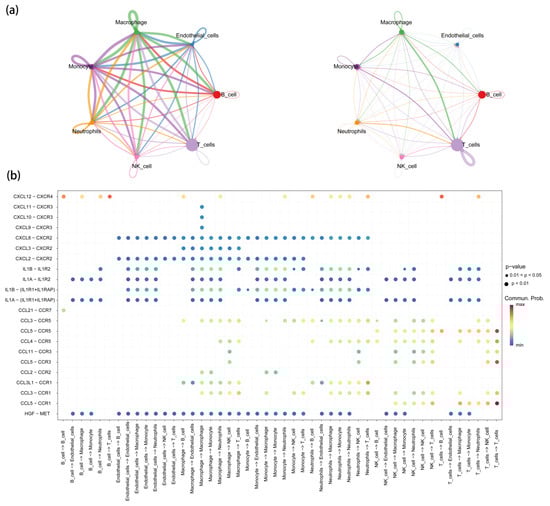 (a) The frequency and intensity of intercellular communication; (b) Bubble plot of receptor–ligand-mediated intercellular communication.