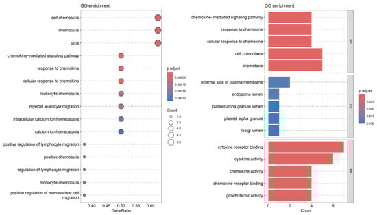 The biological process (BP) enrichment analysis demonstrated that inflammatory cytokines are extensively involved in multiple biological processes, with pathways related to chemokine-mediated signaling being particularly prominent. The molecular function (MF) analysis revealed that at the molecular level, inflammatory cytokines are primarily associated with cytokine activity and cytokine receptor binding. The cellular component (CC) enrichment analysis further highlighted the activity of inflammatory cytokines in specific cellular structures, such as the extracellular region of the plasma membrane and the lumen of platelet alpha granules. Furthermore, the KEGG analysis identified key pathways related to inflammatory cytokines, including cell chemotaxis and calcium homeostasis (Figure 4).