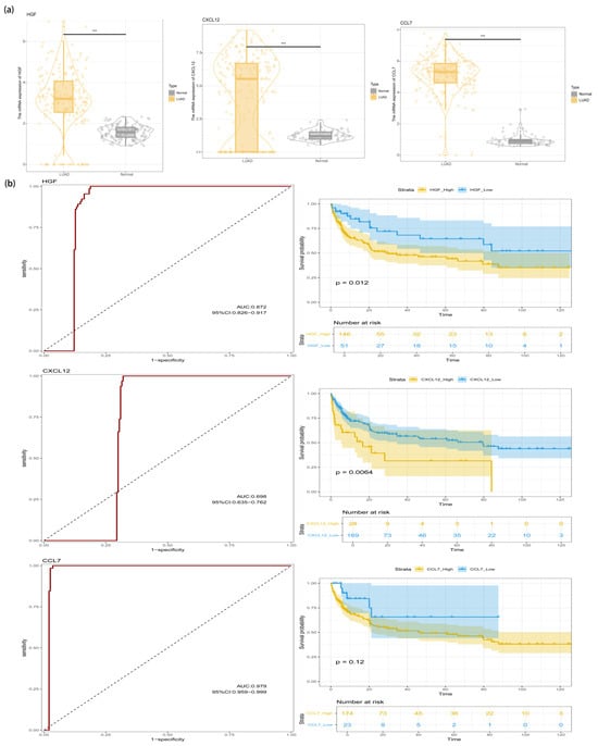 (a) Differential expression of HGF, CXCL12, and CCL7 between normal and LUAD tissues; (b) ROC curve analysis and K–M survival curves of HGF, CXCL12, and CCL7. (*** p < 0.001).