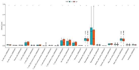 Immune infiltration differences between high and low HGF expression groups. (* p < 0.05, ** p < 0.01).