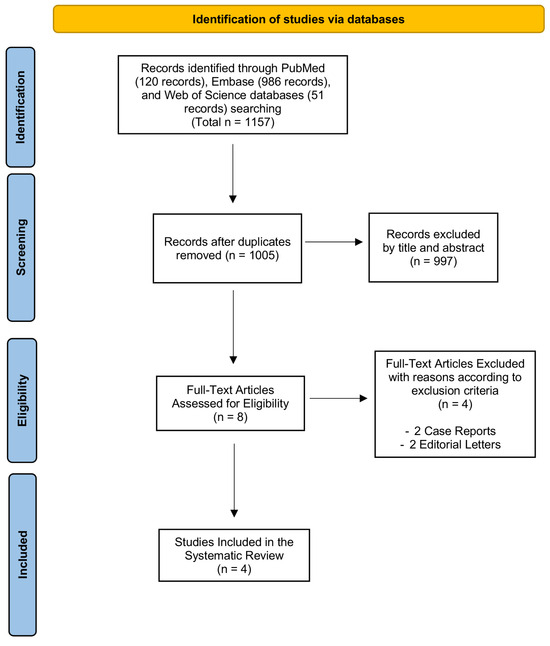 Using our established search strategy, we retrieved a total of 1157 records from PubMed (MEDLINE), Web of Science, and Embase (OVID). After removing duplicate entries, 1005 articles remained. Titles and abstracts were then screened to assess eligibility, which resulted in the exclusion of 997 articles that did not meet the criteria. This left eight articles for full-text review. Studies were excluded during the full-text review phase if they did not meet the inclusion criteria. Four did not fit the required study design, or failed to provide clear data (Supplementary Table S2).