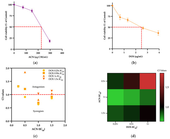 ACN inhibited cell growth and showed synergistic effects with DOX. Cell net growth of 4T1 triple negative breast cancer treated for 48 h with (a) ACN (0–300 µg C3R/mL) or (b) DOX (0–20 µg/mL). (c) CI values of ACN in combination with DOX. ACN IC50 and DOX 0.25 IC50 (ACN-DOX) showed the lowest CI value, having a higher synergistic effect in cell viability. (d) Heatmap of synergistic combinations of ACN and DOX IC50 proportions. Cell viability (% of DMSO control) were determined as outlined in Section 2. Values are average (n ≥ 3) ± SD. Synergistic combination was assessed using CompuSyn software (www.combosyn.com, accessed on 12 June 2023).