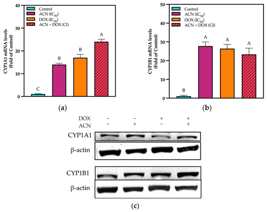 Results showed that CYP1A1 mRNA was upregulated by ACN, DOX, and ACN-DOX up to 14-, 17-, and 24-fold of the control, respectively (Figure 2a).