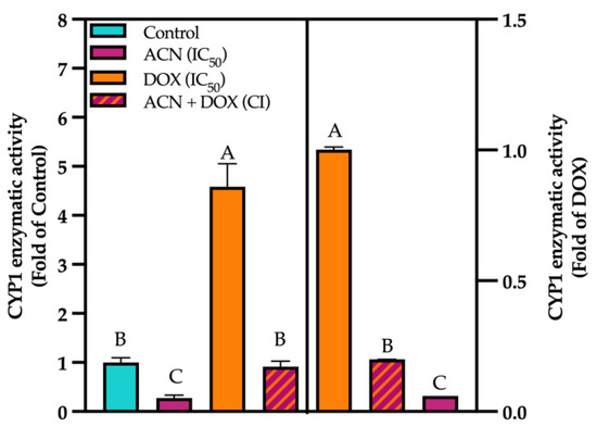 CYP activity was lowered by ACN. Enzymatic activity of CYPs. Cells were treated with DMSO or ACN (IC50), DOX (IC50), and ACN-DOX (CI) for 2 h. Resorufin production was quantified using EROD method as outlined in Section 2. Activity was compared against DMSO control (left panel) and against DOX as a control (right panel). Values are average (n = 3) ± SEM, p < 0.05. Different capital letters indicate statistically significant differences (p < 0.05).