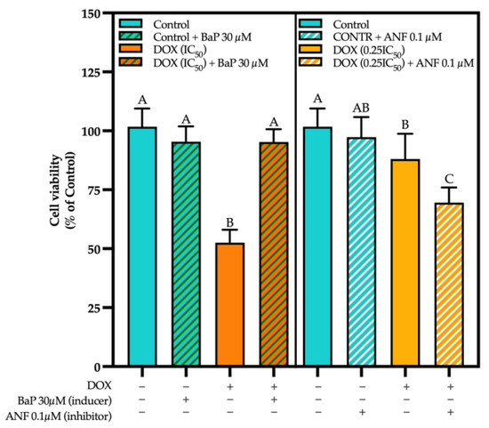 Cell viability is impacted by induction/inhibition of CYPs. Cell viability using a CYP inducer (left panel). Cells were treated with DOX (0–20 µg/mL) in presence or absence of CYP inducer Benzo[a]pyrene (30 µM). Cell viability using a CYP inhibitor (right panel). Cells were treated with DOX (0–20 µg/mL) in presence or absence of CYP inhibitor Alpha-naphthoflavone (1.5 µM). Cell viability and net growth (% of DMSO control) were determined as outlined in Section 2. Different capital letters indicate statistically significant differences (p < 0.05).