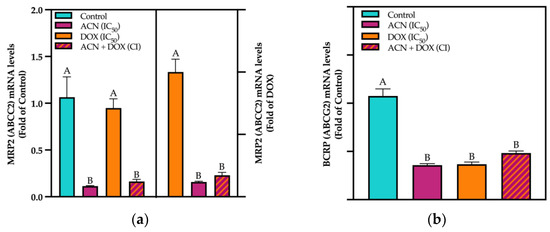 Phase III drug transporters are membrane proteins that actively transport a wide range of substrates across cellular membranes. Among the phase III drug transporters that play a critical role in the pharmacokinetics and pharmacodynamics of drugs used to treat BC are BCRP (ABCG2), MRP2 (ABCC2), and P-gp (MDR1/ABCB1) [48]. For ABCC2 gene expression (encoding for MRP2 protein), results showed that ACN and ACN-DOX downregulated the mRNA levels to 0.11- and 0.17-fold of control, respectively. While DOX showed no difference against the untreated control (Figure 5a, left panel).