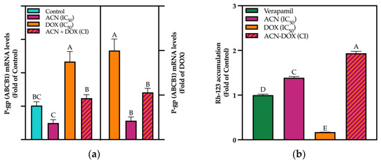 P-gp is a member of the ATP-Binding Cassette (ABC) transporter family and uses energy derived from ATP hydrolysis to pump substrates out of cells. It is particularly important in DR as it expels chemotherapeutic agents from cancer cells, reducing their intracellular concentrations and effectiveness. Results from mRNA levels of ABCB1 (responsible for encoding P-gp) showed that ACN downregulated its expression down to 0.49-fold of control, while DOX upregulated to 2.33-fold of control, and in the combination ACN-DOX, the mRNA levels were like the control (Figure 6a, left panel).
