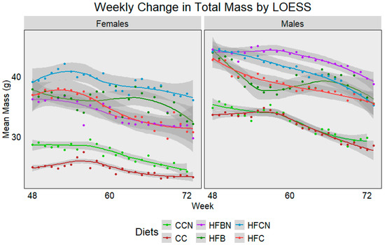 For reporting purposes, the dietary groups were reported as follows: Control Chow with Ammonium Hydroxide Enhancement (AHE) of Dietary Casein = CCN; Group 2: Control Chow, Non-AHE Dietary Casein = CC; Group 3: High-Fat (HF), Dietary Beef + AHE = HFBN; Group 4: HF, Dietary Beef = HFB; Group 5: HF, Dietary Casein + AHE = HFCN; and Group 6: HF, Dietary Casein (HFC). The average weekly mass from each diet and sex was plotted using Locally Estimated Scatterplot Smoothing (LOESS) (Figure 2). Lines were generated using measurements from all available mice, and dots were added to indicate the true mean total mass for each week. Sample sizes ranged from 24 mice at week 48 to ~7 at week 72 per group. Gray bands indicate SE calculated using R for LOESS. Figure 2 demonstrates a gradual decrease in mass associated with age, regardless of sex, although each diet presents a slightly different sex-dependent profile. In females, HFCN demonstrates the highest total mass, followed by the HFB, HFC, and HFBN, respectively. Both the CC and CCN groups were observed to have an average body mass ~10 g less than those on the high-fat diets, with CCN slightly higher than CC. Interestingly, males exhibit a different total mass profile. For males, HFBN demonstrated the highest total mass, followed by HFCN, HFC, and HFB, respectively. Like the females, the CC and CCN males had average total body mass ~10 g less than those on the high-fat diets, although CC and CCN averages were much closer in the males. It is also important to note that the HFB females and males demonstrated the only increases in total mass occurring with age, but this increase was brief and quickly decreased at ~65 weeks. These data are explored in more depth for 0 to 72 weeks in our previous publications [19,20,21], where body mass composition, microbiota differences, and cancer incidence were also discussed.