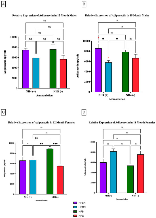 Comparison of the adiponectin protein levels over time among different dietary protein sources ± AHE. Adiponectin protein levels were compared between sex and two different time points (12 months and 18 months) with respect to the effects of the dietary protein source ± AHE. (A) Male mice at the 12-month time point. (B) Male mice at the 18-month time point. (C) Female mice at the 12-month time point. (D) Female mice at the 18-month time point. The colors represent diet groups as follows: purple = HFBN, blue = HFCN, green = HFB, and red = HFC. Statistical significance is denoted by ns = no significance; * = p < 0.05; ** = p < 0.01; *** = p < 0.001.
