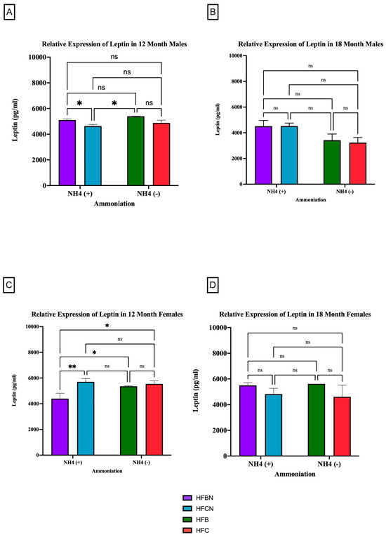 Comparison of the leptin protein levels over time among different dietary protein sources ± AHE. Leptin protein levels were compared between sex and two different time points (12 months and 18 months) with respect to the effects of dietary protein source ±AHE. (A) Male mice at the 12-month time point. (B) Male mice at the 18-month time point. (C) Female mice at the 12-month time point. (D) Female mice at the 18-month time point. The colors represent diet groups as follows: purple = HFBN, blue = HFCN, green = HFB, and red = HFC. Statistical significance is denoted by ns = no significance; * = p < 0.05; ** = p < 0.01.