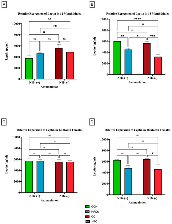 Comparison of the effects of dietary fat content on leptin expression. Leptin protein levels were compared between sex and two different time points (12 months and 18 months) with respect to the effects of dietary protein source ± AHE. (A) Male mice at the 12-month time point. (B) Male mice at the 18-month time point. (C) Female mice at the 12-month time point. (D) Female mice at the 18-month time point. The colors represent diet groups as follows: green = CCN, blue = HFCN, burgundy = CC, and red = HFC. Statistical significance is denoted by ns = no significance; * = p < 0.05; ** = p < 0.01; *** = p < 0.001; **** = p < 0.0001.