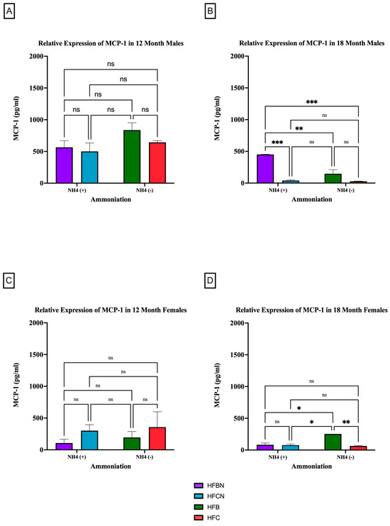 Comparison of the MCP-1 protein levels over time among different dietary protein sources ±AHE. MCP-1 protein levels were compared between sex and two different time points (12 months and 18 months) with respect to the effects of dietary protein source ± AHE. (A) Male mice at the 12-month time point. (B) Male mice at the 18-month time point. (C) Female mice at the 12-month time point. (D) Female mice at the 18-month time point. The colors represent diet groups as follows: purple = HFBN, blue = HFCN, green = HFB, and red = HFC. Statistical significance is denoted by ns = no significance; * = p < 0.05; ** = p < 0.01; *** = p < 0.001.