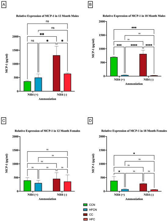 Comparison of the effects of dietary fat content on MCP-1 expression. MCP-1 protein levels were compared between sex and two different time points (12 months and 18 months) with respect to the effects of dietary protein source ± AHE. (A) Male mice at the 12-month time point. (B) Male mice at the 18-month time point. (C) Female mice at the 12-month time point. (D) Female mice at the 18-month time point. The colors represent diet groups as follows: green = CCN, blue = HFCN, burgundy = CC, and red = HFC. Statistical significance is denoted by ns = no significance; * = p < 0.05; ** = p < 0.01; *** = p < 0.001; **** = p < 0.0001.
