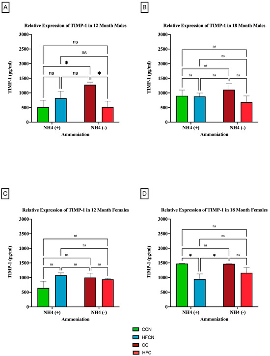 Comparison of the effects of dietary fat content on relative expression levels of TIMP-1. TIMP-1 protein levels were compared between sex and two different time points (12 months and 18 months) with respect to the effects of dietary protein source ± AHE. (A) Male mice at the 12-month time point. (B) Male mice at the 18-month time point. (C) Female mice at the 12-month time point. (D) Female mice at the 18-month time point. The colors represent diet groups as follows: green = HFCN, blue = HFCN, burgundy = CC, and red = HFC. Statistical significance is denoted by ns = no significance; * = p < 0.05.