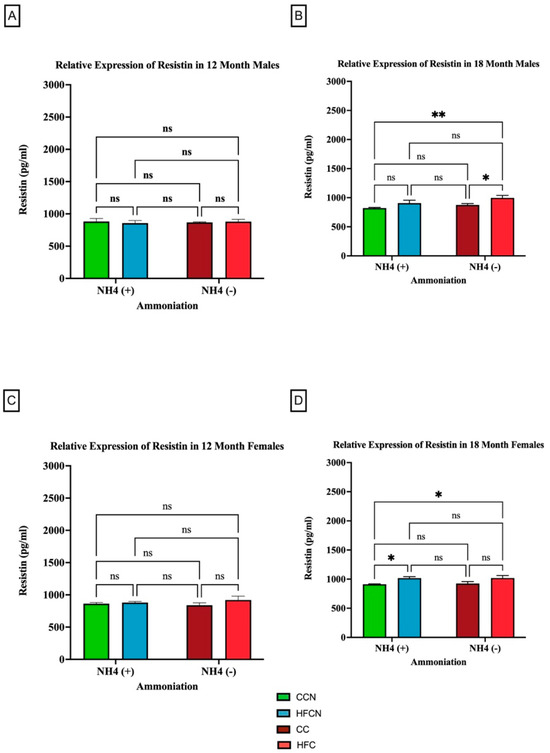Comparison of the effects of dietary fat content on resistin expression. Resistin protein levels were compared between sex and two different time points (12 months and 18 months) with respect to the effects of dietary protein source ± AHE. (A) Male mice at the 12-month time point. (B) Male mice at the 18-month time point. (C) Female mice at the 12-month time point. (D) Female mice at the 18-month time point. The colors represent diet groups as follows: green = CCN, blue = HFCN, burgundy = CC, and red = HFC. Statistical significance is denoted by ns = no significance; * = p < 0.05; ** = p < 0.01.